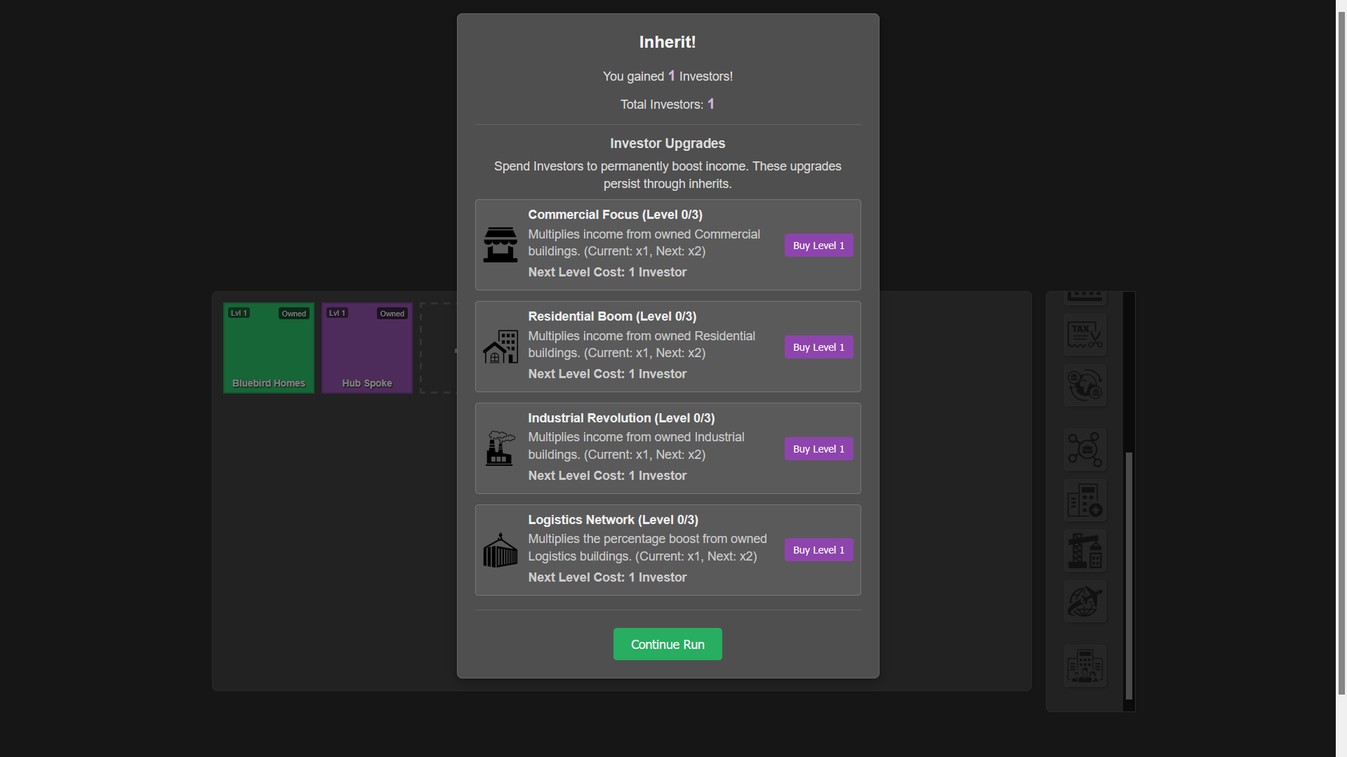 When your wealth reaches astronomical heights, face the ultimate choice: Inherit. Sacrifice your hard-earned empire to gain powerful Investors, unlocking permanent, game-altering upgrades that persist through every new beginning. Each run gets faster, your potential grows larger, pushing you closer to the final objective.